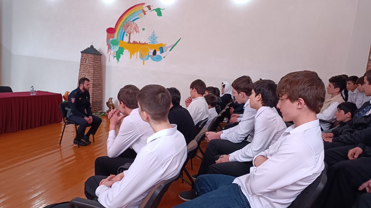 Инспектор ПДН ОМВД России по Грозненскому району младший лейтенант полиции Хусаинов А. Л. - А. провел беседу с учащимися на тему "Военные профессии".
