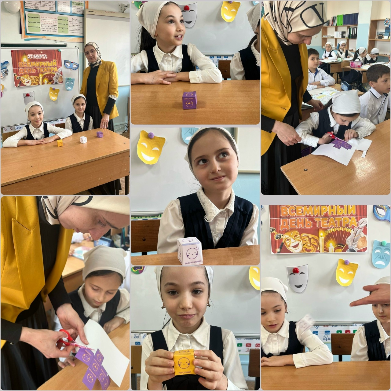 В преддверии Всемирного дня театра в 3 классе по инициативе советника директора по воспитанию Адкадиевой М.М. была организована увлекательная игра «Истории с эмоциями». Участники собрали развёртку куба, на каждой грани которого нанесены различные эмоции. В ходе игры ребята поочередно бросали куб и придумывали фрагменты истории, в которых необходимо было отразить выпавшую эмоцию.Цель игры – развить воображение, научить осознавать причины и последствия эмоций, а также помочь детям лучше понимать и выражать свои чувства.Это был замечательный способ погрузиться в мир эмоций и театрального искусства!