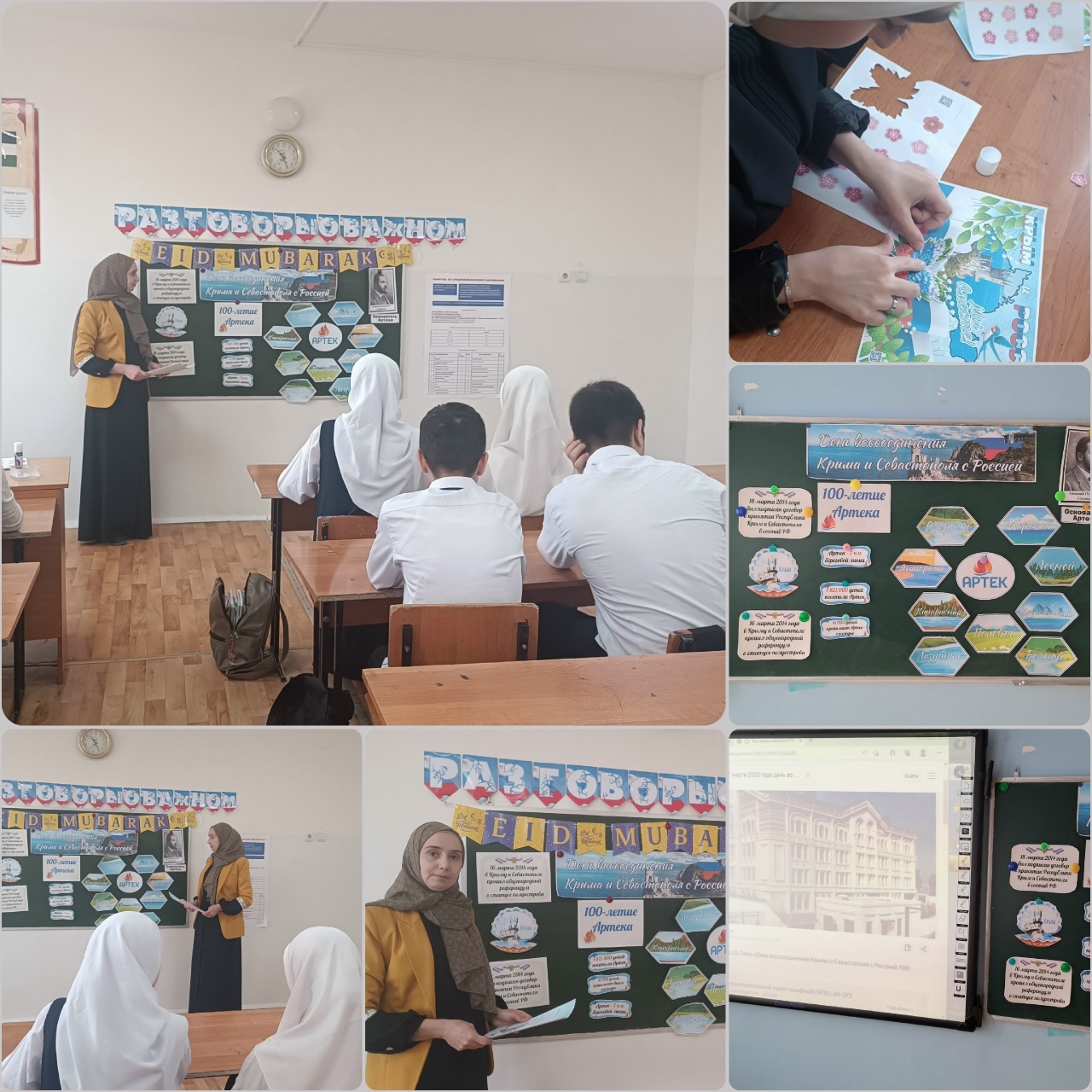 17.03.2025В преддверии празднования дня воссоединения Крыма с Россией советник директора по воспитанию Адкадиева М.М. провела исторический час «Воссоединения Крыма и России» в 9 классе. Ребята познакомились с историей Крымского полуострова, узнали первых городах, основанных на этой территории, а также о том, что впервые территория Крыма вошла в состав тогда ещё Российской Империи при Екатерине II.В завершении занятия ребята порассуждали о том, что значит Крым для России и Россия для Крыма. В Крыму все пронизано нашей историей и нашей гордостью. 18 марта исполняется 11 лет со дня вхождения Крыма в состав Российской Федерации. Дружба и помощь – залог единства нашей Родины!Также ребята узнали, что международный детский центр Артек в 2025 году отмечает свое 100-летие! В 2014 году Артек вместе с Крымом вернулся в Россию. За 11 лет лагерь был модернизирован и стал передовым образовательным центром страны, дающим возможность.Историческое наследие, а оно у Артека значительное, — это большая ценность. Если мы обратимся к карте звездного неба, то среди бесчисленного множества звезд найдем чуть заметную светящуюся точку – это малая планета (астероид) № 1956, которой дали имя «Артек». 100 лет!Сменялись поколения, происходили грандиозные события, менявшие облик страны и мира, менялись государственные границы, а Артек стоит!